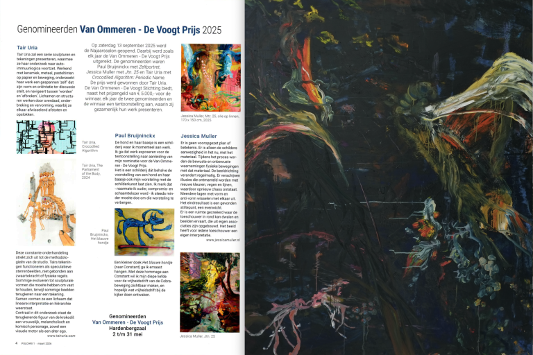 As a nominee, Jessica Muller will show new artworks during the Exhibition nominees ‘Van-Ommeren-de-Voogt’Kunstprijs. From May 2 to 31, 2026, in the Hardenbergzaal of Pulchri…